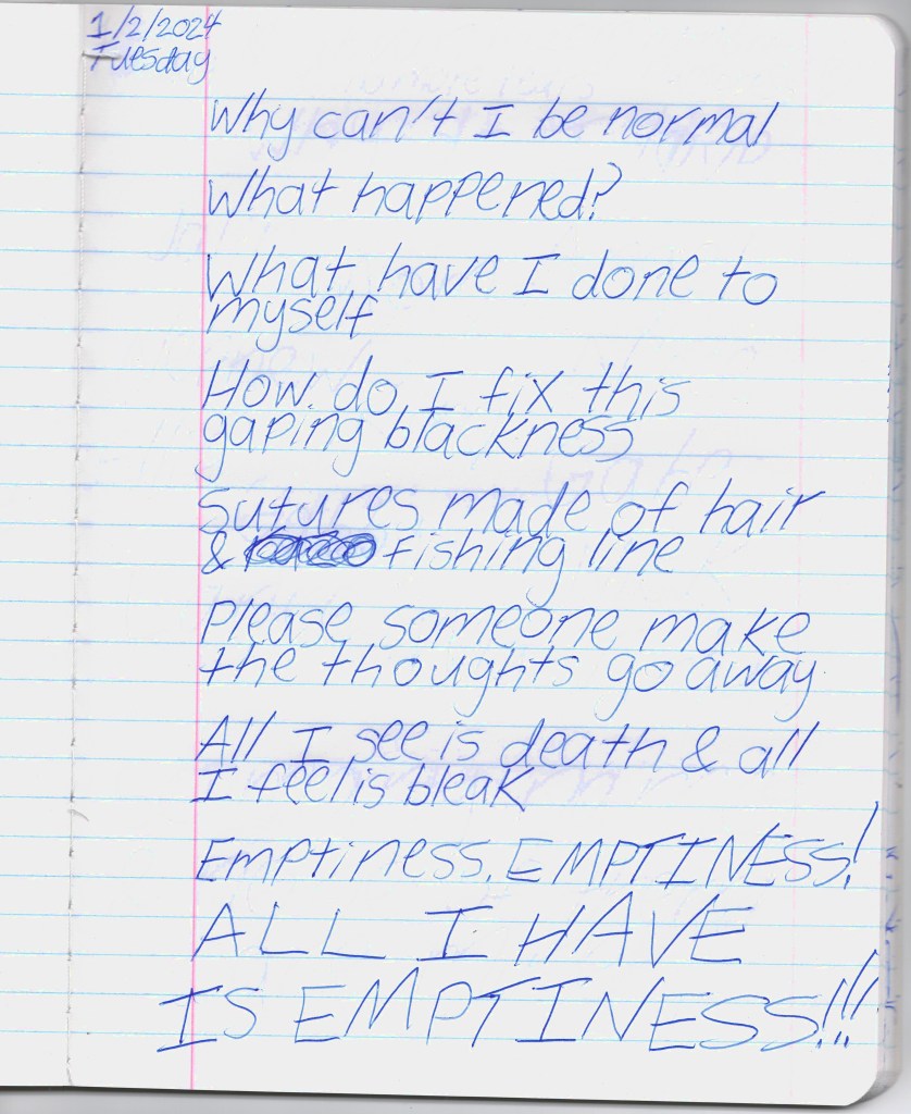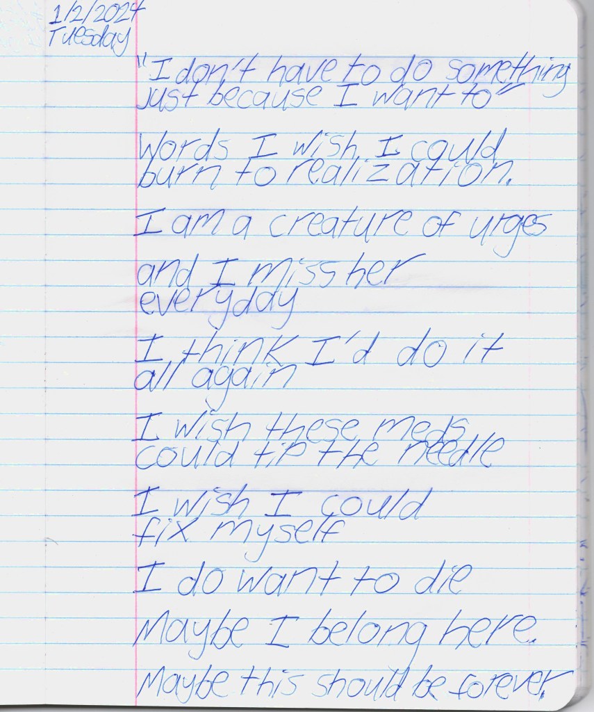 Bela & I were “psych ward twins.” (BPD-addled transgender ketamine fiends) We were hospitalized for similar reasons, & she journaled religiously throughout her stay. She discharged before me, headed to out-of-state residential, & gave me her journal to publish. Its contents made her uncomfortable, but she felt people should “see the reality” of what these experiences are like, & hoped it might help others feel less alone. THE BLEAK TIMES is not a hopeful read. Bela wanted to get better & was looking forward to residential, but was pessimistic about her ability to achieve lasting recovery. I have not heard from her since we parted ways in January. Names & places have been redacted per her request. The diary will be published one day at a time.