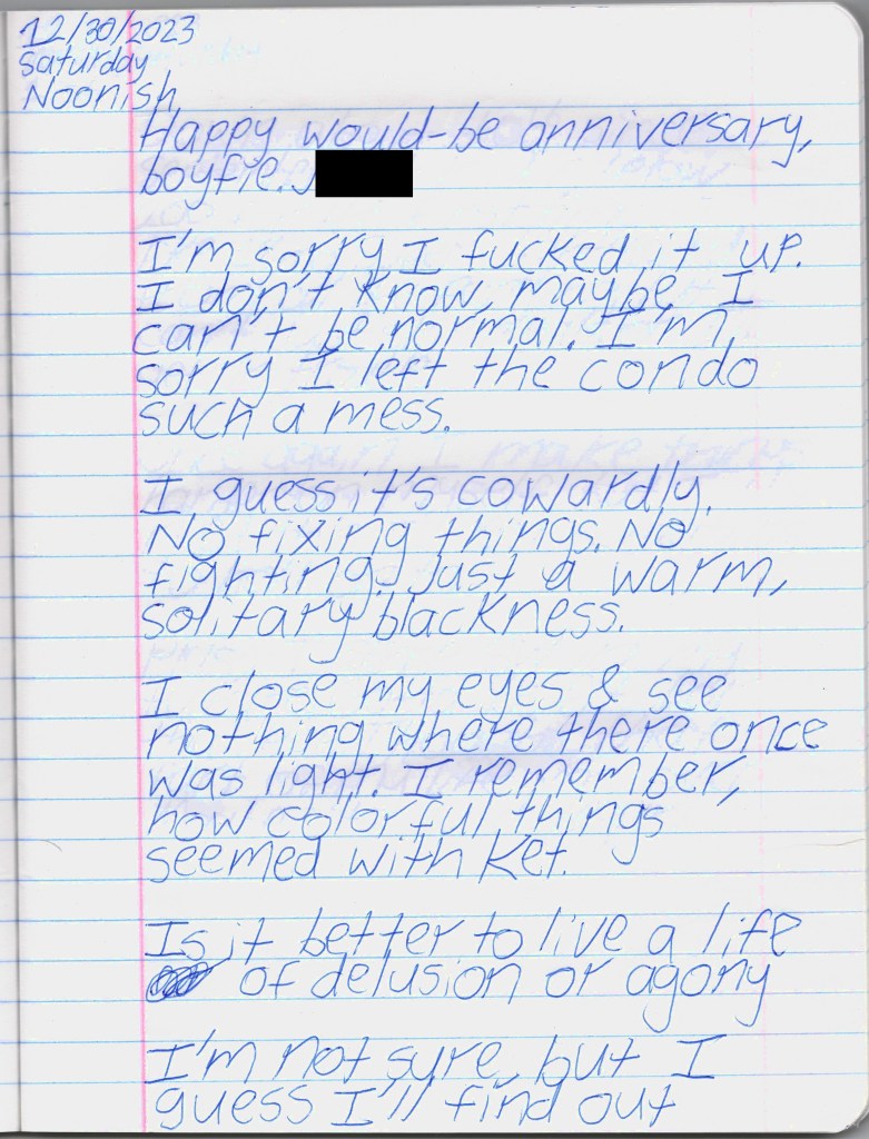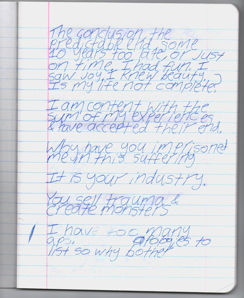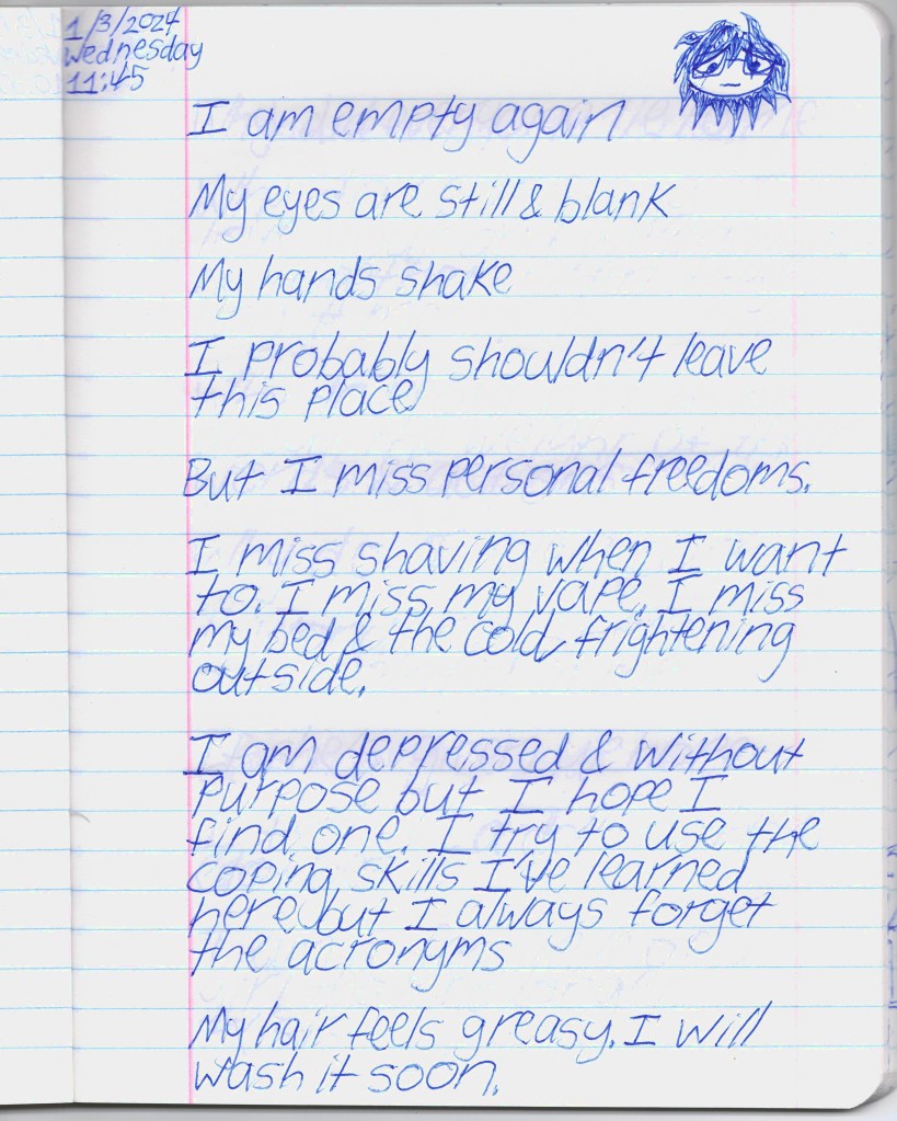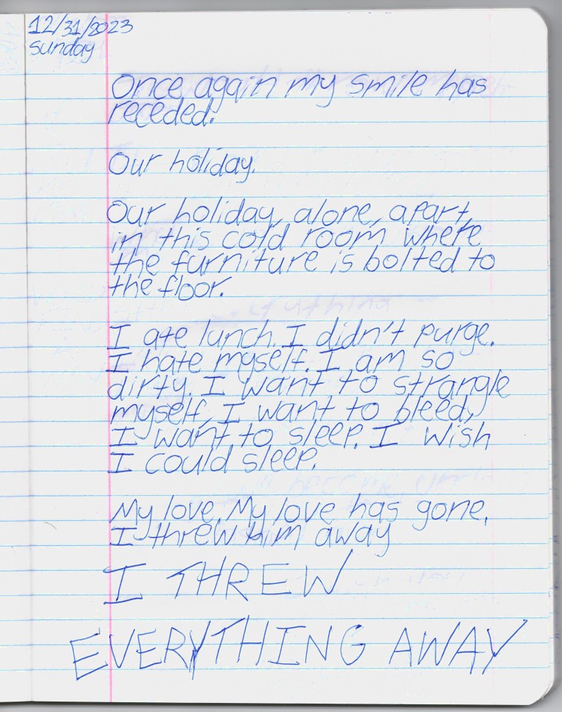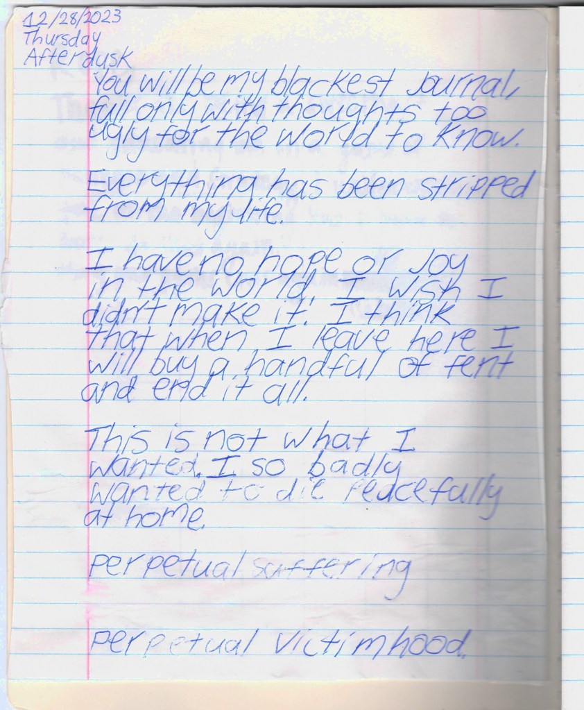Bela & I were psych ward twins, BPDemon transgender ketamine fiends hospitalized for attempting suicide. Whether by chance or fate, we were brought together & immediately became inseparable. She discharged before me, headed to out-of-state residential, & gave me her journal to publish. THE BLEAK TIMES tells a sad story with a vague, pessimistic ending, but it’s only one brief chapter of our lives. Fortunately, neither of them ended here. We hope you find this strange piece of art to be illuminating, relatable, bizarre, humorous, fascinating, & disturbing. THE BLEAK TIMES is an exercise in vulnerability–without an audience, it cannot be called art. Thank you for your contribution to this project.